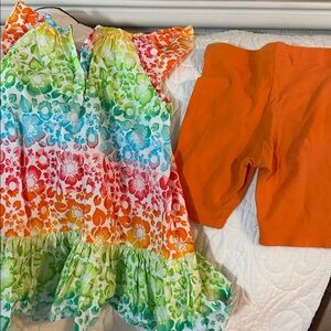 Charming dress with vibrant floral patterns. Includes matching shorts.