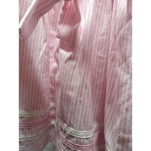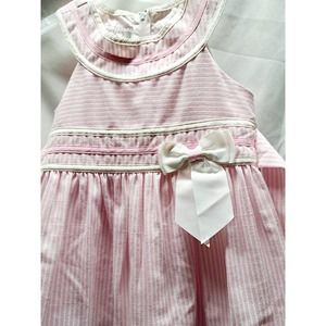 Bonnie Jean Pink White Stripe Silver Metallic Threads Summer Lined Sun Dress. Front, Rounded neckline, empire waist with bow accent and tie/zipper in back