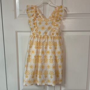 Stylish dress with intricate yellow patterns on white fabric. Ideal for bright occasions.