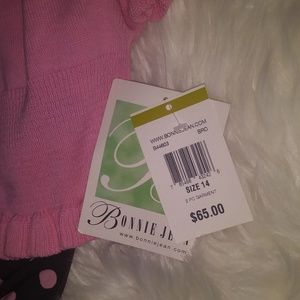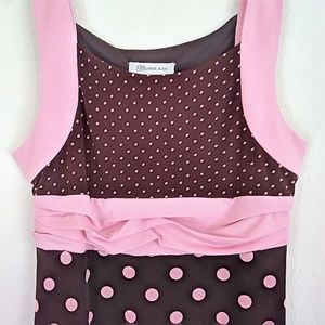 NWT Brown dress with light pink polka dots. It comes with a cropped light pink sweater. There is some slight snagging around the bottom hem in front of the dress (see last picture). Size 14