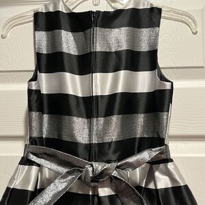 This is a beautiful dress for any special occasion. The silver is metallic and pops this dress with style. The diagonal striped on top are also flattering. There is a black liner underneath that gives the dress its fullness. This dress is in excellent condition!