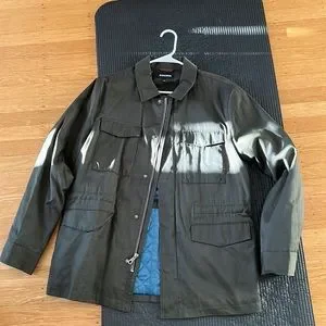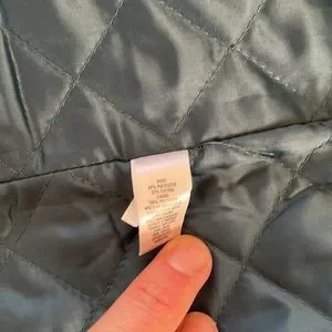 Green in color. Soft silky exterior finish. Hardly worn and in good condition. Size medium. Fits true to size.