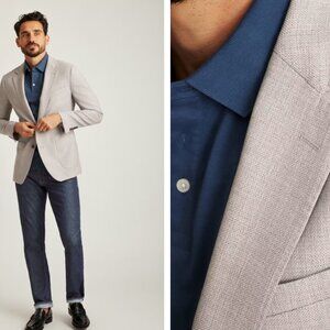 Lightly constructed and minimally lined | Breathable wool hopsack from Italy's Marzotto mill | 3-1/4" lapel | Patch pockets | Two-button single-breasted | Unlined interior with shoulder support and binding at seams | Sleeve lining | Non-functional buttons at cuffs | Double vent | Interior welt pockets