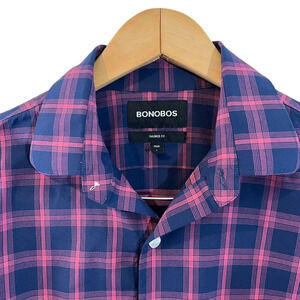 Bonobos Mens Button Up Plaid Shirt Size Small Short Tailored Fit Navy Pink Thin