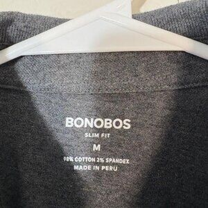 Visible brand markings: "BONOBOS" with "SLIM FIT", "M", "98% COTTON 2% SPANDEX", "MADE IN PERU" printed at the neck