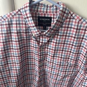 Experience the perfect blend of style and comfort with this Bonobos casual button-down shirt. Crafted in a vibrant red and blue plaid pattern, it's ideal for laid-back outings. The lightweight fabric ensures a relaxed fit for all-day wear.