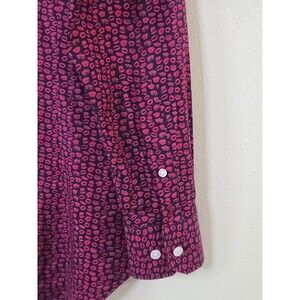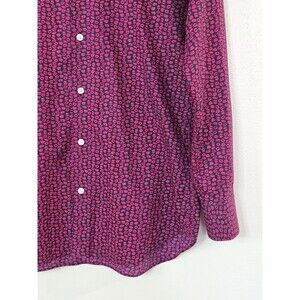 The Bonobos Tailored Slim Fit Shirt in size 15.5 / 33 features a unique pattern of kisses, making it a stylish choice for casual or business occasions. Made from a blend of spandex and cotton, this button-down shirt boasts a slim fit and long sleeves, perfect for a modern and polished look. The pink and black color and woven fabric add a touch of vibrancy and sophistication, while accents like the spread collar and button closures add a timeless appeal to the overall design. Ideal for men looking for a lightweight and breathable shirt that is both stylish and comfortable.