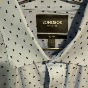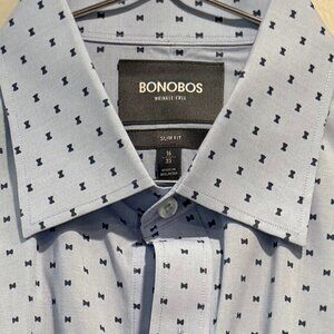 Look sharp and polished in this Bonobos slim-fit, wrinkle-free men's dress shirt. Sized with a 16" neck and 35" sleeve, it features a light blue fabric adorned with a neat, dark blue geometric bowtie print. This shirt offers a clean, modern silhouette perfect for business or formal events.