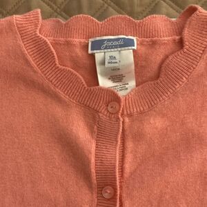 Bonpoint girls cardigan sweater with scalloped neck & hem, front pearl button closure, long sleeve ribbed cuff, hem & crew neck.