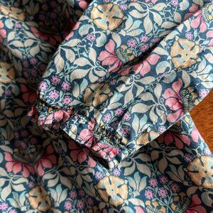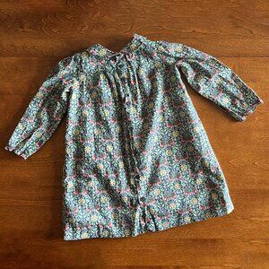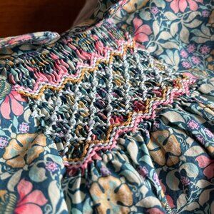 Bonpoint Juju floral print dress in classic Liberty of London Persephone fabric. Toddler girls' size 3. Sweet rounded collar and smocking across the chest. Fully lined with buttons up the back. 100% cotton fabric. VGUC; slight wash wear.