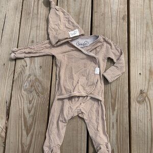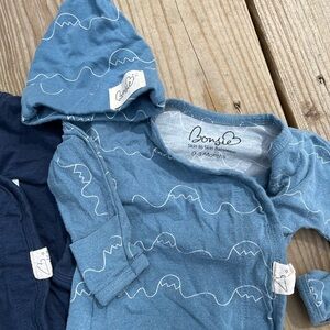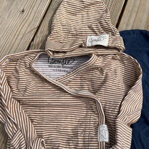 It’s bonsie skin-to-skin baby wear, in a bundled format that makes the most of that shipping cost! Two adorable footies and a sleep bag, with fold over mitten sleeves, and two matching hats to go with. These are in excellent used condition; the material is high end and washes well. The colors are blue with a subtle cloud print, solid navy blue, and tan/white striped. Please ask any questions!