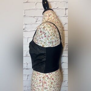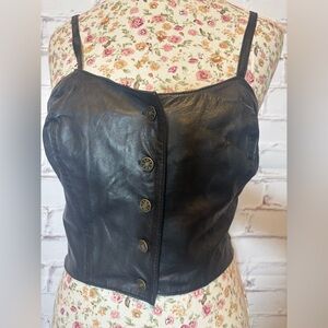 Rev up your wardrobe with this Bonus Black Leather Stretch Back Sleeveless Button Front Cropped Top.