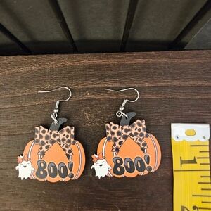Boo Wood Dangle Pierced Earrings. Pumpkin with Ghost