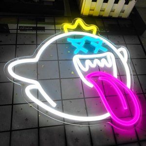 ✨Trendy & chic neon blue, pink, yellow & white Boo Ghost Mario Kart sign. Perfect decor for game room, man cave, bathroom, teenagers’ room, dorm, office/work space, bed/living room, photo prop, & parties!