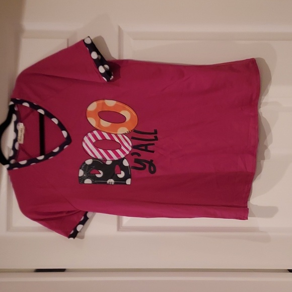 pink shirt with black and white polka dot trim, boo ya'll screenprint