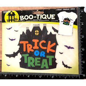 Elevate your Halloween attire with this Boo-Tique Trick Or Treat iron-on transfer. Ideal for adding a festive touch to t-shirts or costumes.