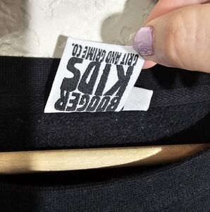 Pre-owned Booker Kids Grit and Grime Co sweatshirt, size XXL. It's made of a cotton/polyester blend fabric, has very little stretch to it, and it comes in black and white with various currency symbols printed all over.