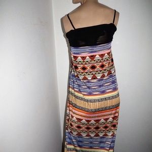 Cute and comfortable black, orange and blue dress with adjustable straps. Polyester/Elastane. Approximately 48" long from the armpit to the hem. In excellent condition..