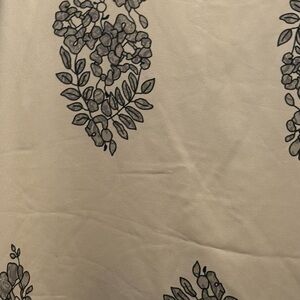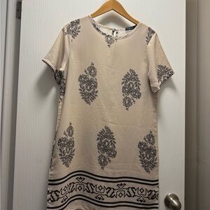 Elegant beige dress with intricate black floral patterns. Short sleeves and round neckline.