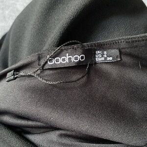 This chic black sheath dress from Boohoo features a stylish asymmetrical design, perfect for a cocktail night out. The V-neckline and dolman short sleeves add a touch of elegance, while the sleek silhouette ensures a flattering fit.