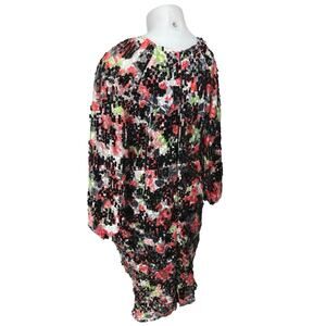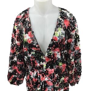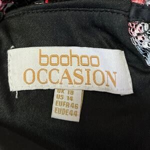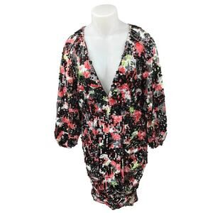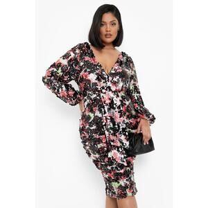 Boohoo Black Red Sequin Long Puff Sleeve Deep V-Neck Midi Sheath Dress Size 14