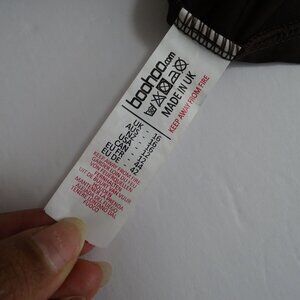 This Boohoo bodycon dress features a cross-front design with a keyhole cutout, offering a stylish and sleek look. Made with a comfortable polyester blend.