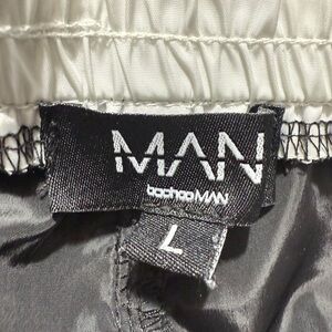 These Boohoo cargo pants feature a stylish black and gray color scheme, perfect for a modern look. The elastic waistband ensures a comfortable fit, making them ideal for everyday wear. Crafted from lightweight fabric, they offer ease of movement and a contemporary twist on the classic cargo style.