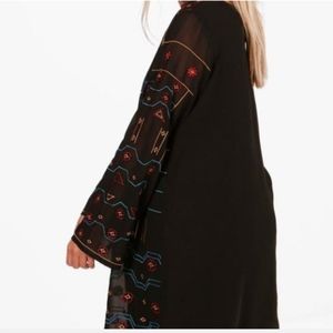 Embroidered shift dress from Boohoo. Black with blue, red, and yellow abstract patterns. Long mesh sleeves. Button neck closure in the back. Breathable material with slip underneath. Size US 14. Nice for a holiday party. Only worn once, so in excellent used condition. Please review pictures.
