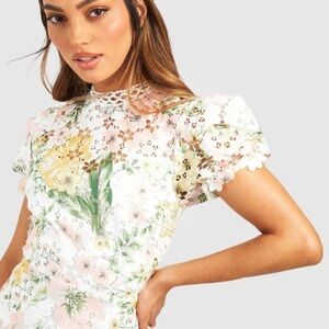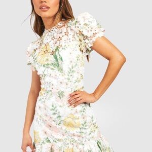 Charming mini dress with floral pattern. Features ruffled sleeves and hem. Ideal for casual outings.