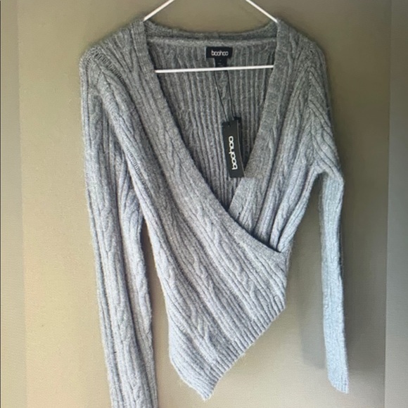 Stylish gray wrap sweater. Ribbed texture. Long sleeves. V-neck design.