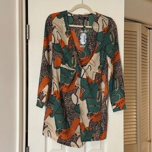 Looking for a timeless classic? Look no further than this shift dress. A short dress that hangs straight down from the shoulders with clean and simple lines, a shift dress is comfortable, versatile, and perfect for day-to-night plans. This season we're loving this style in bright prints, embroidered details and bold sleeves. Pair with chunky boots or keep things casual with chunky trainers. If the sun's not shining, opt for a black shift dress you can layer with tights and boots...sorted.Style: Wrap DressDesign: ChainFabric: SatinLength: MiniNeckline: V NeckSleeve Length: Long Sleeve