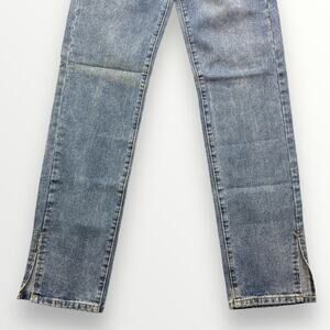 Slits on bottom hem. Straight leg. High waist. Mid blue. US 4, EU 36, UK 8, CA 4.