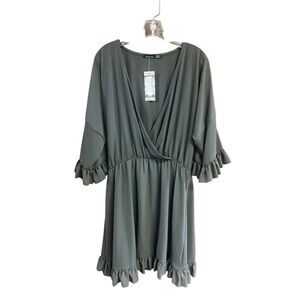 Boohoo Khaki Green Ruffle Sleeve Wrap Dress Sz 14 NWT 3/4 sleeve