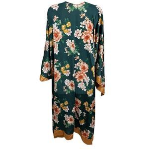 Boohoo Kimono Japanese Floral Green Gold Formal Wide Bell Sleeves Midi Duster