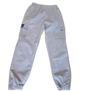 Stylish light gray joggers. Features cargo pockets. Elastic waistband and cuffs. Perfect for casual wear.