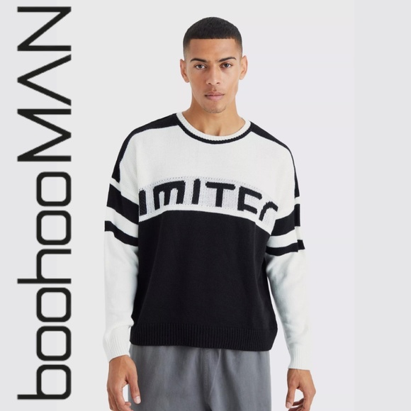 NWT Boohoo Man Oversized Boxy Color Block Sweater. Size Extra Small. Black And White. Crew Neck. Long Sleeves. 100% Acrylic