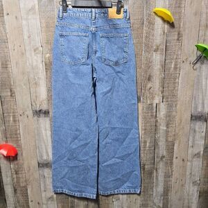 Details: high waisted, medium wash, zip fly, little stretch, wide leg