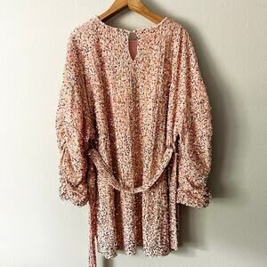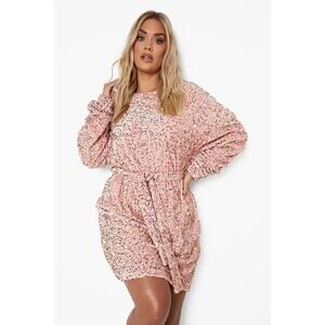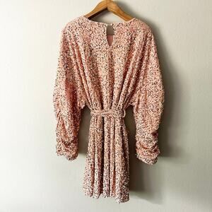 Sparkling pink mini dress. Features all-over sequins. Long sleeves with a relaxed fit. Perfect for parties.