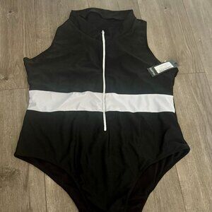 This Boohoo one-piece swimsuit features a bold black and white colorblock design with a sleek racer-style silhouette. The front zip detail adds a sporty vibe while making it easy to slip on and off. High neckline and full coverage back offer support and style for pool days or beach vacations. Brand new with tags!