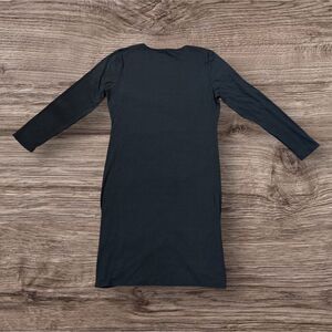 Elegant black dress with rib and ruched detailing. Long sleeves. Perfect for any occasion.