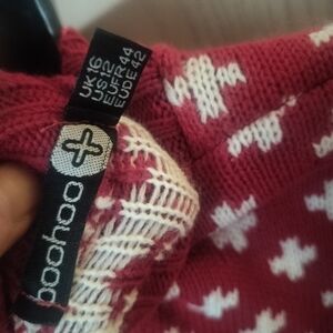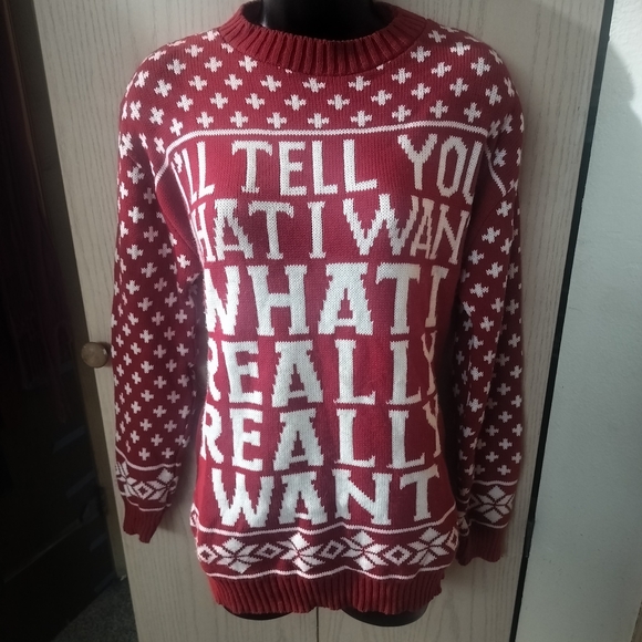 Bold red sweater with eye-catching graphic text. Ideal for casual wear.