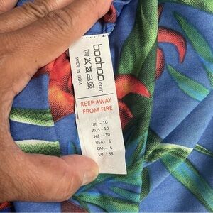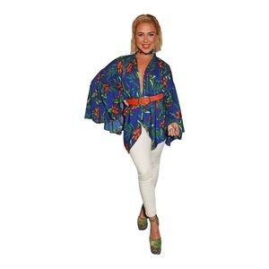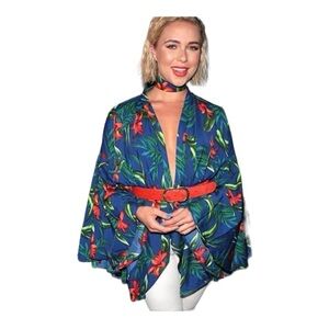 Boohoo Sapphire Blue Red Hibiscus Waist Kimono Jacket sz 10 Bell sleeves
