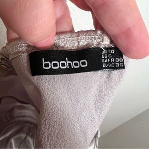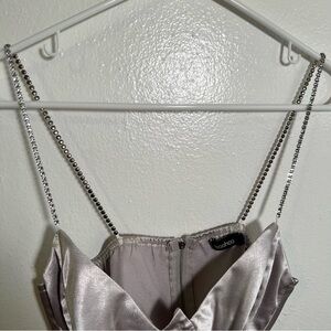 Great condition. Boohoo. Satin Diamante Strap corset top. Silver color. Full zip back. Rhinestone strap. Size 6. Missing material tag. Pit to pit laying flat 13.5” shoulder to hem 13.5”. All measurements are approximate and taken lying flat. Smoke free home. No trades, offers welcome.