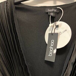 NWT Elegant Boohoo satin dress featuring pleated angel sleeves and asymmetrical hem.