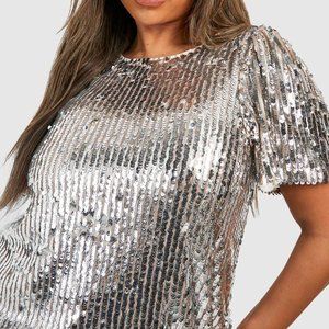Boohoo Silver Sequin Puff Sleeve Plus Size Party Dress, UD 20 NWT