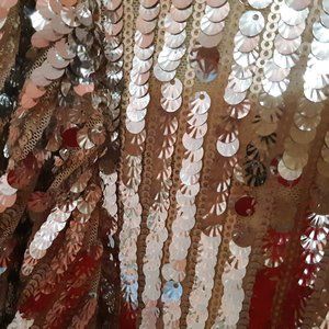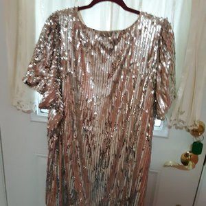 Very sparkly pretty puff sleeve dress from Boohoo - their sizing is very confusing, so I accidentally ordered a US size 20, and then it was too expensive to send it back. It is 25" from armpit to armpit, 26" across the waist, and there is quite a bit of stretch. The sequins alternate rows of silver sequins with smaller sort of beige color sequins. It is fully lined. It is 37" long from the shoulder to hem. Photos have a slight pinkish tinge because my walls are apricot pink, but it is really silver like the photo from the Boohoo website.