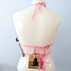 Boohoo Tropicana Tie Triangle Recycled Bikini Top. String bikini top with tie neck and back straps. Hot pink and orange tropical print.