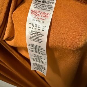 Bright orange fabric with Boohoo branding. Stylish and bold choice. With sexy slit in front of dress