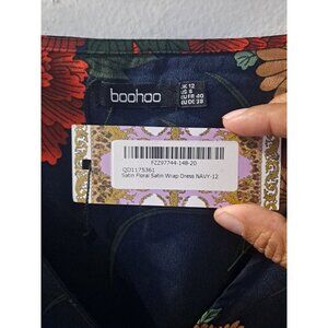 Boohoo Women Satin Floral Navy Wrap Midi Dress, Classy, Colorful, Vibrant, Size 12, NWT