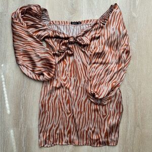 Stylish mini dress with zebra print. Features a bold pattern in brown and white. Perfect for a night out.
